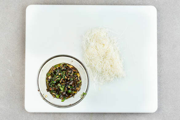 Die Kürbiskerne grob hacken. Die Basilikumblätter grob schneiden. Den Käse fein reiben. Die Kürbiskerne und die Basilikumblätter mit 1EL Olivenöl, 1EL Balsamicoessig sowie je 1 Prise Salz und Pfeffer verrühren.