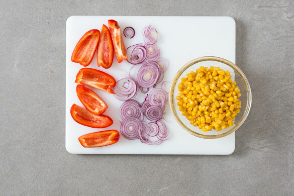 Den Backofen auf 240°C (220°C Umluft) vorheizen. Die Paprika halbieren, entkernen und in ca. 2cm breite Streifen schneiden. Die Zwiebeln schälen und in hauchdünne Ringe schneiden. Den Mais in einem Sieb abtropfen lassen.