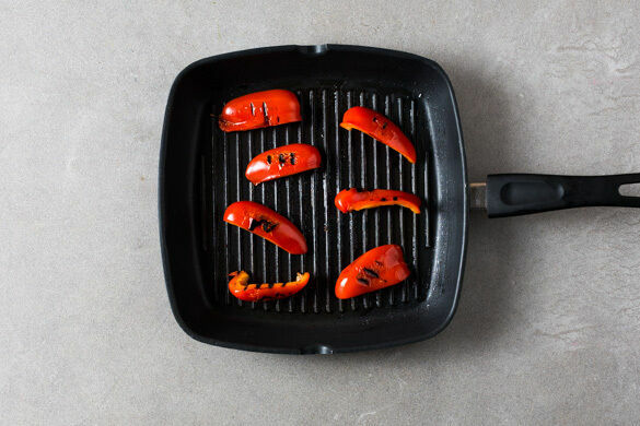 Die Paprikastreifen mit 2EL Pflanzenöl vermengen und in einer Grillpfanne oder einer beschichteten Pfanne auf höchster Stufe 2–3Min. ohne Wenden anbraten. Erst jetzt wenden und weitere 2–3Min. braten. Es sollten deutliche Röstspuren zu sehen sein. Die Paprika mit 1 kräftigen Prise Salz würzen und aus der Pfanne nehmen.
