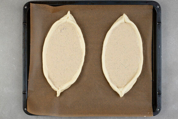 Die Teige von dem Backpapier lösen und das Papier auf jeweils ein Backblech legen. Die Teige halbieren und die Ränder zur Mitte hin aufrollen. Die oberen und unteren Spitzen zusammendrücken, sodass 4 Boote mit Rand entstehen. Die Boote auf die Backbleche geben und die Sauce gleichmäßig auf den Teigen verteilen.