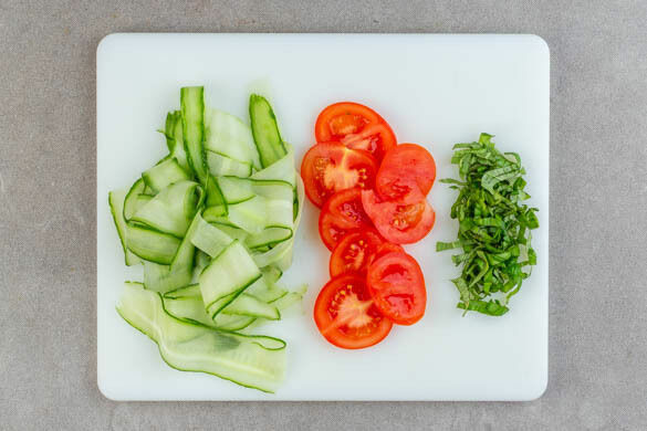 Die Gurke mit einem Sparschäler rundum in lange, dünne Streifen schneiden. Die Tomaten in dünne Scheiben schneiden. Die Basilikumblätter von den Stängeln zupfen und fein schneiden.