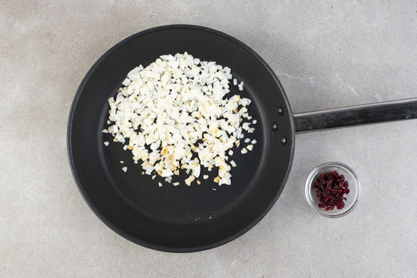 Die Kokosflocken in einer kleinen Pfanne bei mittlerer Hitze 1–2Min. goldbraun anrösten. Zum Abkühlen aus der Pfanne nehmen. Aufpassen, dass die Kokosflocken nicht zu dunkel werden. Die 1/2 der Cranberrys grob hacken.