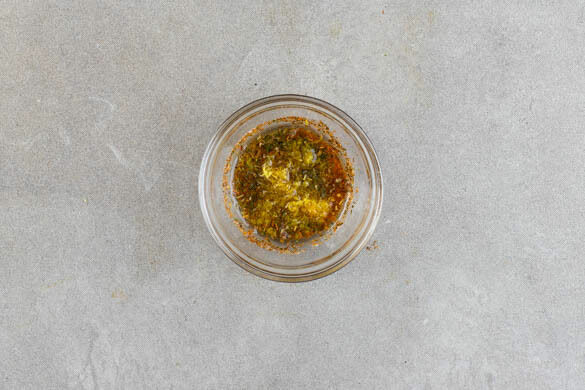 Den Backofen auf 230°C (210ºC Umluft) vorheizen. Die Zitronenschalen abreiben, eine Zitrone halbieren und auspressen, die andere Zitrone in dünne Scheiben schneiden. Die griechische Gewürzmischung, die Knoblauch-Kräuter-Gewürzmischung, die Zitronenschale, 2EL Zitronensaft und 4EL Olivenöl verrühren. Mit ½TL Salz und 1 kräftigen Prise Pfeffer würzen.