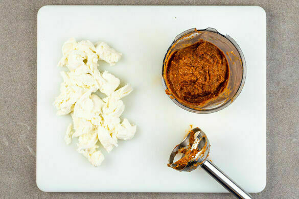 Den Käse fein reiben. Den Knoblauch schälen und fein würfeln. Ca. ⅓ der Tomaten, die getrockneten Tomaten, die ½ der Pinienkerne, ½TL Knoblauch und ¾ des Basilikums mit 2EL Olivenöl und 1–2EL Wasser fein pürieren. Die ½ des Käses untermischen und mit Salz und Pfeffer abschmecken. Den Mozzarella in mundgerechte Stücke zupfen.