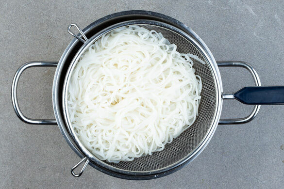Die Nudeln in das kochende Wasser geben und gut umrühren. Den Topf vom Herd nehmen und die Nudeln ohne Hitzezufuhr 5–8Min. ziehen lassen. Sie sollen weich, aber noch bissfest sein. In ein Sieb abgießen und kalt abschrecken.