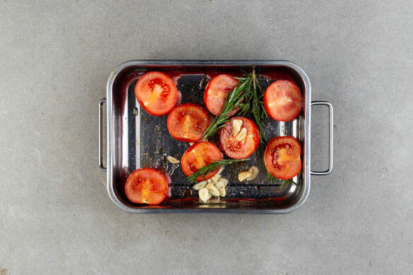Den Backofen auf 220°C (200°C Umluft) vorheizen. Die Tomaten halbieren. Den Knoblauch schälen und in feine Scheibchen schneiden.