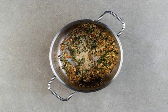 Die Petersilie, die Mandeln und das Panko-Paniermehl in einem großen Topf mit 2EL Olivenöl bei mittlerer Hitze unter stetigem Rühren in 3–5Min. goldbraun anrösten. Vom Herd nehmen und die Hefeflocken untermengen. Das Topping aus dem Topf nehmen und beiseitestellen.
