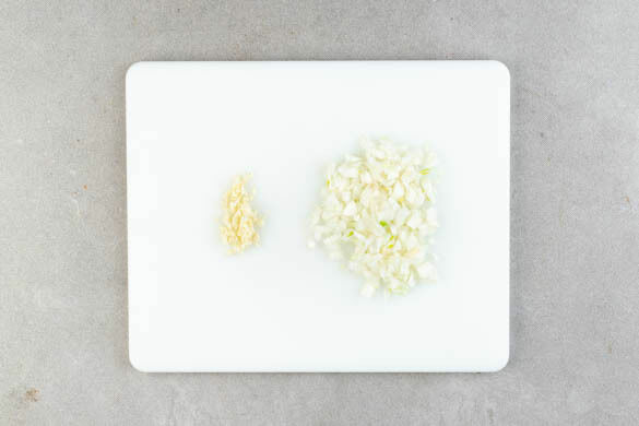 Die Zwiebel schälen, halbieren und fein würfeln. Den Knoblauch schälen und grob würfeln.