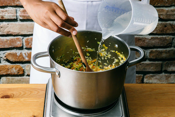 Die Karotten, die Zucchini und die Zwiebeln in einem mittelgroßen Topf mit 1EL Olivenöl bei starker Hitze 1–2Min. scharf anbraten.