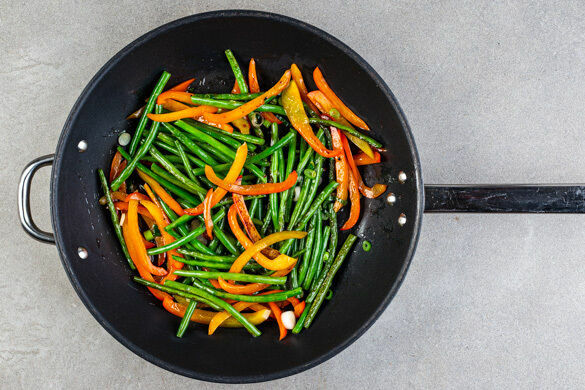 Den Knoblauch in einer großen Pfanne mit 2EL Pflanzenöl bei mittlerer bis starker Hitze ca. 1Min. anbraten. Die Bohnen, die weißen Lauchzwiebelringe und die Paprika dazugeben und 2–3Min. unter Rühren anbraten.