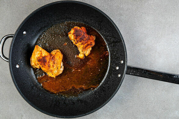 Das Fleisch in einer großen Pfanne mit 2EL Pflanzenöl bei starker Hitze von jeder Seite 3–4Min. braten, bis es knusprig und gar ist. Dann die Pfanne vom Herd nehmen.