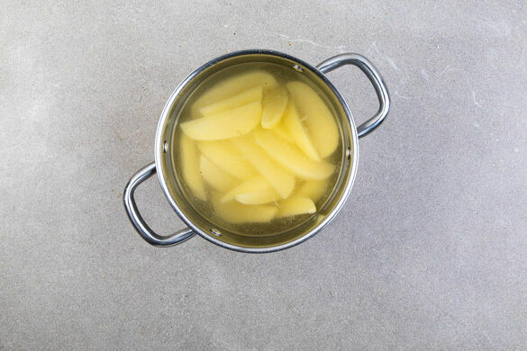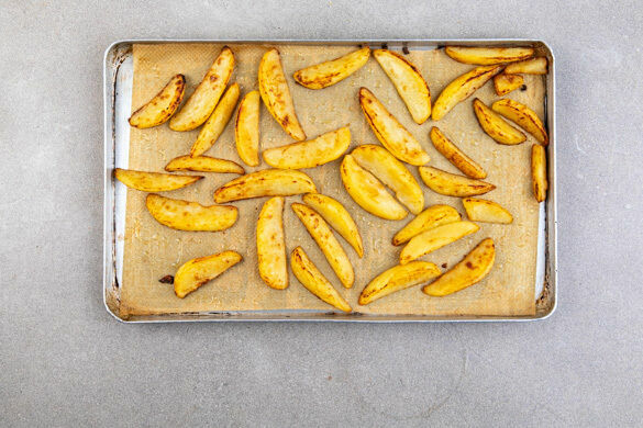 Den Backofen auf 240°C (220°C Umluft) vorheizen. In einem mittelgroßen Topf ausreichend gesalzenes Wasser für die Kartoffeln zum Kochen bringen. Ein mit Backpapier ausgelegtes Blech dünn mit Olivenöl bepinseln und im Ofen aufheizen. Die Kartoffeln schälen, halbieren und in Spalten schneiden und ca. 5Min. im kochenden Wasser vorkochen.