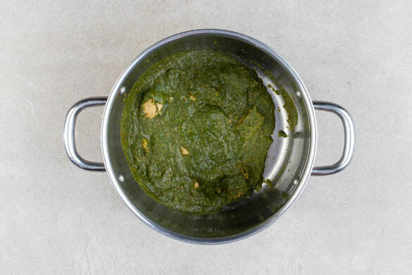 Mit etwas Wasser ablöschen, sodass der Boden des Topfes bedeckt ist. Die Gewürzmischung und 1 Prise Zucker einrühren. ⅔ des Spinats zugeben und ca. 2Min. zusammenfallen lassen. Das Saag aus dem Topf nehmen und in einem hohen Gefäß fein pürieren. Der Topf wird weiterverwendet.