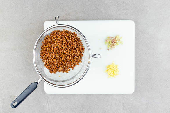 Die Linsen in einem Sieb mit kaltem Wasser abspülen und abtropfen lassen. Den Ingwer schälen und grob würfeln. Das Zitronengras von den zwei äußeren Blättern befreien und fein würfeln.