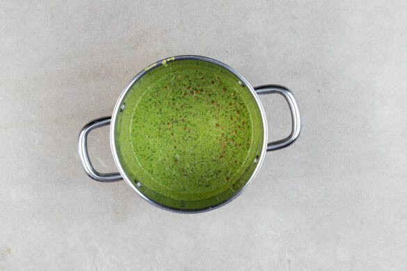 Den Ingwer, das Zitronengras, den Koriander samt Stängeln und den Spinat mit der Kokosmilch und der Sojasauce in einem hohen Gefäß glatt pürieren. Mit 1 Prise Zucker sowie je 1 kräftigen Prise Salz und Pfeffer würzen.