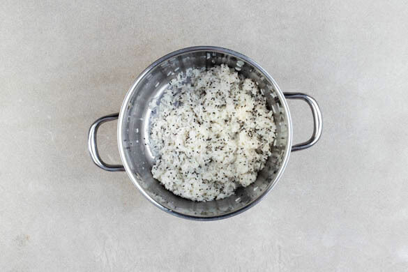 Den Sesam unter den Reis heben. Den Blumenkohl mit der Sauce und dem Sesamreis anrichten und servieren.
