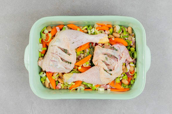Das französische Cassoulet enthält immer weiße Bohnen und Speck und wird im Ofen fertig gegart. Traditionell dauert dies mehrere Stunden, also haben wir uns eine Low-Carb-Variante ausgedacht, die genauso lecker und vielseitig ist, aber deutlich schneller in der Zubereitung! Es gibt saftige Hähnchenschenkel mit Thymiannote, sanft geschmurgelt auf Lauch und Karotten – und natürlich Bohnen und Bacon. Petersilie macht’s perfekt!