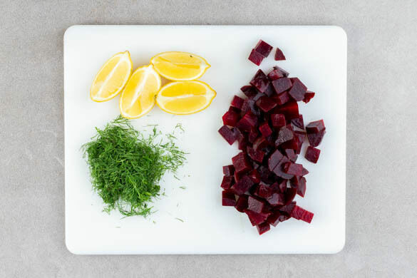 Die Zitrone vierteln. Den Dill fein schneiden. Die Rote-Bete-Flüssigkeit vorsichtig abgießen und auffangen. Die ½ der Roten Bete oder mehr in ca. 1cm große Würfel schneiden. Tipp: Da Rote Bete stark färbt, beim Verarbeiten am besten Küchenhandschuhe und Schürze tragen.