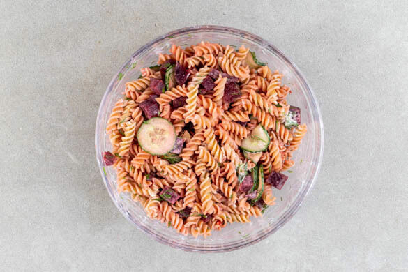 Die Pasta mit den Gurken, der Roten Bete samt Flüssigkeit, ⅔ des Dills und 2EL Mayonnaise vermengen, nach Geschmack mit Salz würzen. Die Pasta mit dem restlichen Dill garnieren und zu den Schnitzeln servieren, die Zitronenspalten dazu reichen.