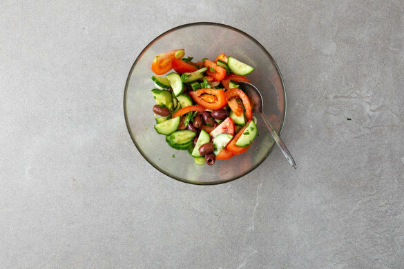 Die Tomaten, die Gurken, die Lauchzwiebeln und die Oliven mit je 2EL Olivenöl und Essig vermengen. Den Salat mit Salz, Pfeffer und 1 Prise Zucker abschmecken und die Petersilie unterheben.