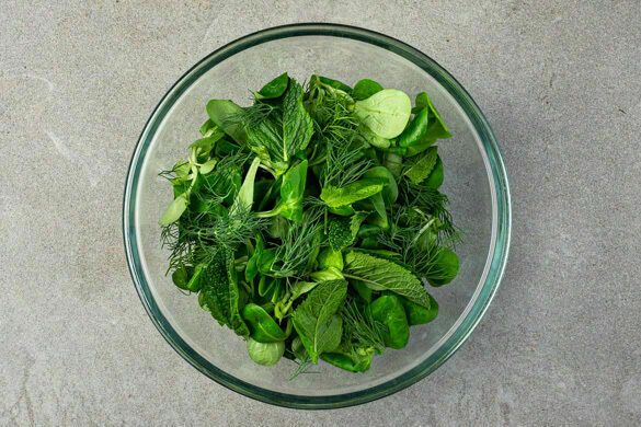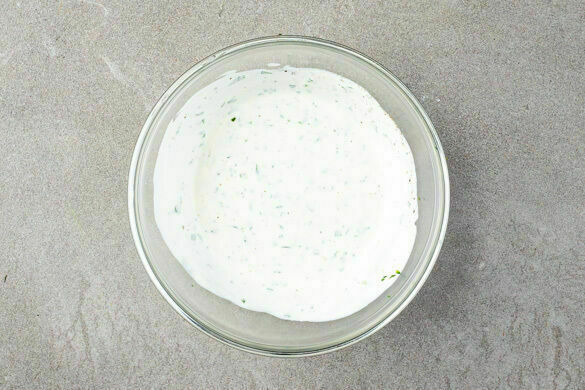 Die Minzeblätter von den Stängeln zupfen, dann fein schneiden. Den Dill samt Stängeln ebenfalls fein schneiden. 5EL Joghurt mit 2EL hellem Essig, 2–3EL Wasser, dem Kreuzkümmel, 1TL Sumach sowie je 1 Prise Salz und Pfeffer verrühren. Ggf. mit mehr Salz und Pfeffer abschmecken.