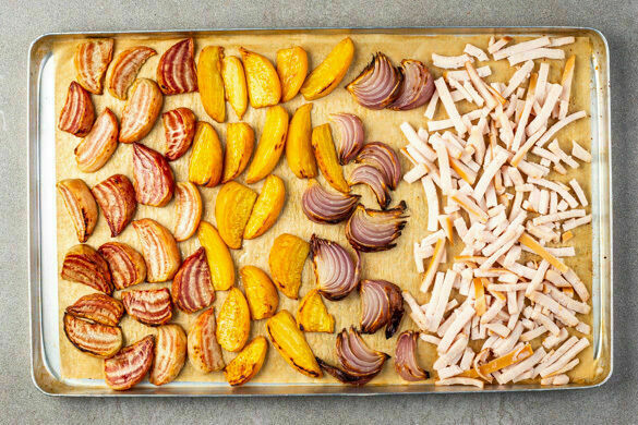 Nach ca. 15Min. Garzeit die geräucherten Hähnchenstreifen neben dem Gemüse auf dem Blech verteilen und 3–5Min. mitbacken, bis die Beten an den Rändern goldbraun sind.