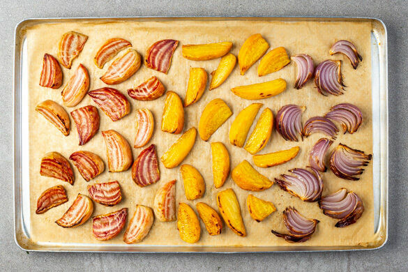 Nach ca. 15Min. Garzeit die geräucherten Hähnchenstreifen neben dem Gemüse auf dem Blech verteilen und 3–5Min. mitbacken, bis die Beten an den Rändern goldbraun sind.