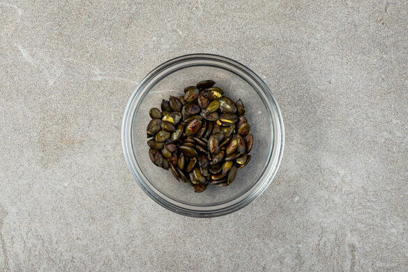 Die Kürbiskerne in einer kleinen Pfanne ohne Zugabe von Fett bei mittlerer Hitze 2–4Min. anrösten, bis sie knistern und goldbraun sind. Zum Abkühlen aus der Pfanne nehmen.