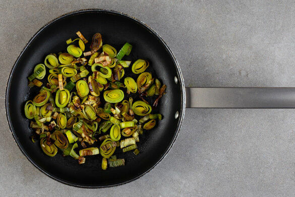 Den Backofen auf 220°C (200°C Umluft) vorheizen. Den Lauch längs halbieren und quer in feine Streifen schneiden, dann in einer großen Pfanne mit 2EL Olivenöl bei mittlerer Hitze 5–7Min. weich braten.
