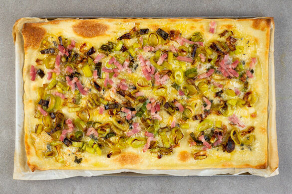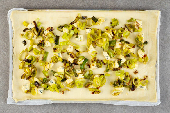 Die Teige mit dem Papier nach unten auf zwei Backblechen ausrollen. Den Blauschimmelkäse in kleine Würfel schneiden und mit dem Lauch gleichmäßig auf den Teigen verteilen.