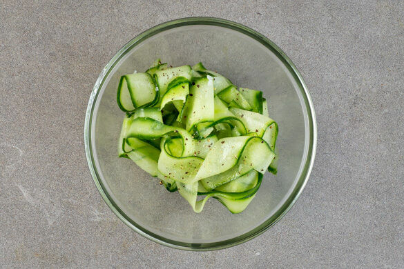 Die Gurken mit einem Sparschäler in breite Streifen schneiden, dabei den weichen Kern aussparen. Die Gurkenstreifen mit 1TL Salz, 1 kräftigen Prise Pfeffer, 2EL Olivenöl und 2EL Essig zu einem Salat vermengen.