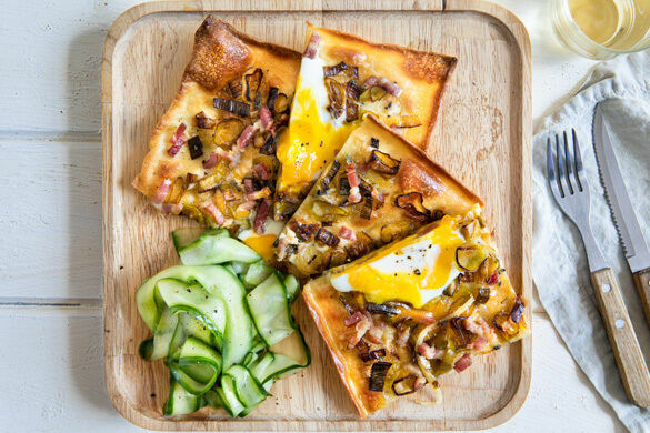 Bodenständig und herzhaft, so präsentiert sich unser Flammkuchen. Wir belegen den Teig heute mit gebratenem Lauch, würzigem Blauschimmelkäse und Baconstreifen. Und dann ab in den Ofen. Doch halt! Wir haben noch eine kleine, exquisite Überraschung parat: Sie kommt in Form von leckeren Bio-Eiern, die gegen Ende der Garzeit auf dem Flammkuchen mitgebacken werden. Herz, was willst du mehr?