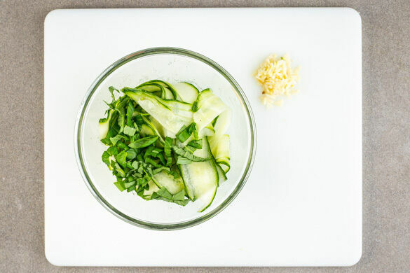 Inzwischen die Gurke mit einem Sparschäler rundum bis zum Kerngehäuse in breite Streifen schneiden. Die Thai-Basilikumblätter von den Stängeln zupfen und grob schneiden. Je 1 kräftige Prise Salz und Zucker mit 1EL hellem Essig verrühren und mit den Gurken sowie dem Basilikum vermengen. Den Knoblauch schälen und fein würfeln.