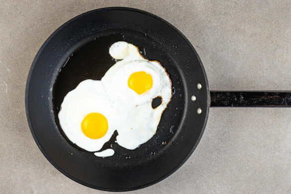 In einer mittelgroßen Pfanne 1TL Pflanzenöl bei mittlerer Hitze erwärmen. Die Eier aufbrechen, in die Pfanne gleiten lassen und in 3–4Min. zu Spiegeleiern braten. Tipp: Wer möchte, dass auch das Eigelb fest wird, verwendet einen Deckel.