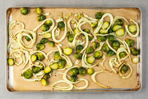 Den Fenchel und den Rosenkohl mit 1EL Pflanzenöl und je 1 Prise Salz und Pfeffer auf einem mit Backpapier ausgelegten Backblech vermengen und im Ofen 15–20Min. backen, bis das Gemüse goldbraun und gar ist.