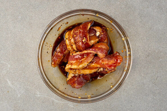 Das Fleisch aus der Würzsauce nehmen und in einer mittelgroßen Pfanne mit 1EL Pflanzenöl bei mittlerer Hitze 3–4Min. auf jeder Seite knusprig und gar braten. Die Würzsauce in den letzten ca. 30Sek. der Garzeit zugeben und köcheln lassen, bis sie eingedickt und klebrig ist.