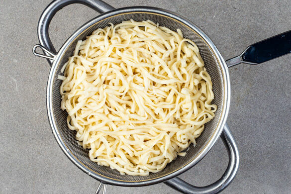 Die Nudeln in das kochende Wasser geben und in 3–5Min. bissfest kochen. In ein Sieb abgießen und kalt abschrecken.