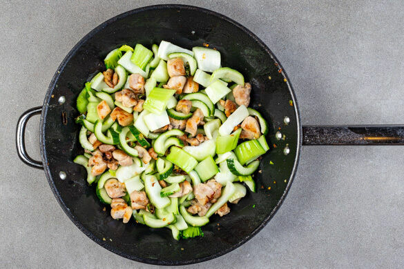 Das Fleisch und die Peperoni mit 1EL Pflanzenöl und 1 Prise Salz in einer großen Pfanne oder einem Wok bei starker Hitze 3–4Min. anbraten, dabei regelmäßig umrühren. Die Gurken und die weißen Teile des Pak Choi dazugeben und 2–3Min. mitbraten.
