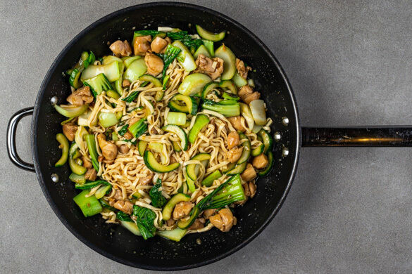 Das historische Königreich der Naxi liegt in der Nähe des Himalajas, einer Region, in der sie seit Tausenden von Jahren leben. Die Esskultur der Naxi hat sich in dieser Zeit stetig verändert und ist in China einzigartig. Heute bekommst du eine kleine Geschmacksprobe von der köstlichen Art, das zarte Hähnchenschenkelfleisch mit Gurke und Pak Choi zu garen, bevor es sich in würziger Sauce mit Mie-Nudeln anfreunden darf. Lecker!