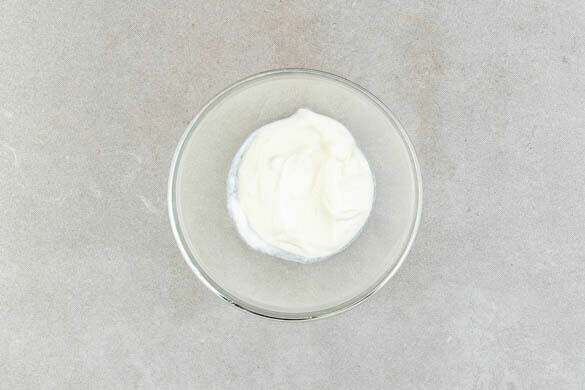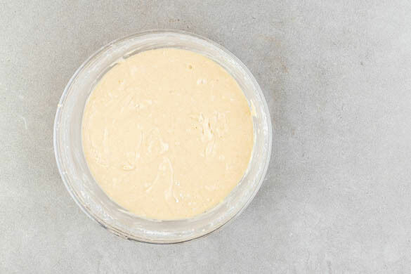 Die Eier und 150g Zucker mit einem Handrührgerät in 2–3Min. schaumig schlagen. Unter stetigem Rühren vorsichtig die Tahinimischung zugeben. Die ½ der Crème fraîche mit 200ml kaltem Wasser, dann mit der Ei-Tahini-Mischung verrühren. Alles gründlich mit dem Mehl vermengen.
