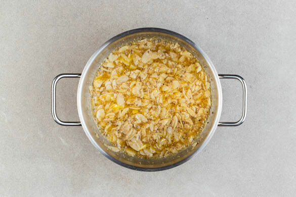 Nach ca. 20Min. Backzeit mit der Zubereitung des Toppings beginnen. 1TL Zucker abmessen und beiseitestellen. Den restlichen Zucker, die Mandeln, den Sesam, 50g Butter, 2EL Honig und 1 Prise Salz in einem kleinen Topf bei niedriger Hitze unter Rühren erwärmen, bis die Butter geschmolzen ist.