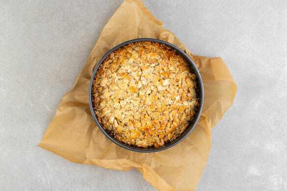 Den Kuchen nach ca. 30Min. Backzeit aus dem Ofen nehmen und gleichmäßig mit dem Mandel-Sesam-Topping bestreichen. Auf der oberen Schiene 10–15Min. weiterbacken, bis der Teig durchgebacken ist. Tipp: Den Kuchen vor Ende der Backzeit mit Alufolie abdecken, falls er zu dunkel wird.