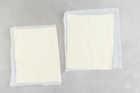 Den Backofen auf 220°C (200°C Umluft) vorheizen. Den Teig mit dem Papier nach unten auf einem Backblech ausrollen und halbieren. Ca. 3cm Rand abmessen und die Teigrechtecke rundherum vorsichtig ein-, aber nicht durchschneiden. Den Teig mit etwas Sahne bestreichen, dann 15–20Min. im Ofen backen, bis der Teig aufgegangen, gebräunt und durchgebacken ist.