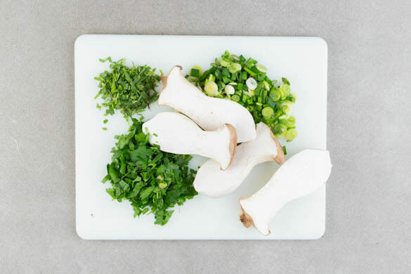 Die Pilze ggf. säubern und längs halbieren. Die Lauchzwiebeln in Ringe schneiden. Die Kräuter samt Stängeln grob schneiden.