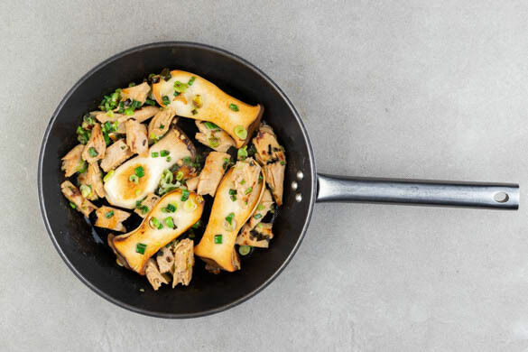Die Pilze, die Lauchzwiebeln und die veganen Hähnchenschnetzel in einer mittelgroßen Pfanne mit 2EL Olivenöl bei starker Hitze rundherum 2–4Min. anbraten, bis die Pilze und die veganen Hähnchenschnetzel leicht gebräunt sind.