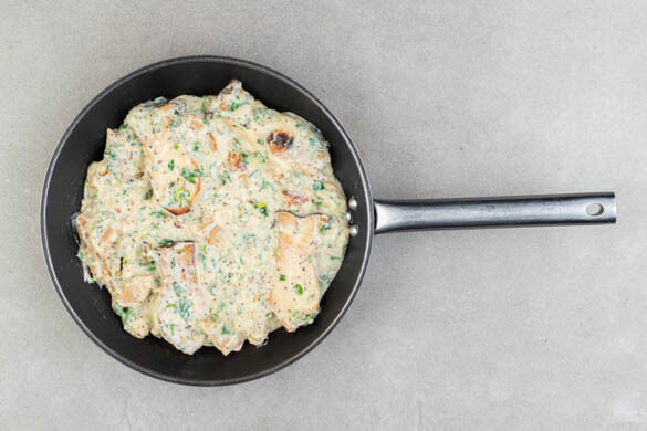Unsere superleckeren veganen Hähnchenschnetzel können vieles – sich als Fisch tarnen allerdings nicht. Das übernehmen die zarten Kräuterseitlinge, die sich mit dem „Hähnchen“ von Heura in einer cremig-kräuterigen Sauce tummeln, als wäre es ein Swimmingpool. Egal ob nun Schiff oder Pool: Dieses Gericht schmeckt phänomenal, macht mächtig was her – und ist dabei ganz leicht zuzubereiten. So geht Genuss pur!