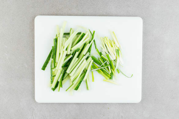 Die Gurken in dünne Stifte schneiden. Die Lauchzwiebeln quer dritteln, die einzelnen Segmente jeweils vierteln.