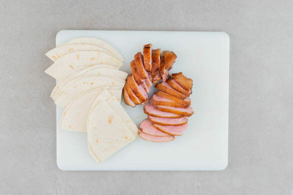 Das Fleisch in dünne Tranchen schneiden. Die Tortillas vierteln. Die Hoisinsauce, die Gurken, die Lauchzwiebeln, das Fleisch und die Tortillas einzeln anrichten, sodass jedes Stück Tortilla unterschiedlich belegt werden kann. Den Brokkoli dazu servieren.