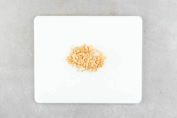 Ein kleines Loch in die Tüte mit den Erdnüssen stechen, sodass die Luft entweichen kann. Die Erdnüsse in der Tüte mit einem schweren Objekt wie dem Boden einer Pfanne oder einem Fleischklopfer zerkleinern. Tipp: Alternativ kannst du die Erdnüsse auch einfach hacken.