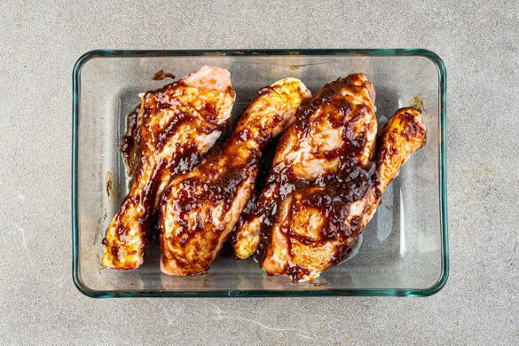 Die Tandoori-Masala-Gewürzmischung in einer großen Auflaufform mit der Kreuzkümmel-Koriander-Gewürzmischung, 4TL Honig, 2EL Pflanzenöl und ½TL Salz verrühren. Das Fleisch trocken tupfen und mit der Würzsauce vermengen.